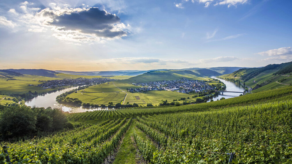 Am steilen Ufer der Mosel wächst ein sehr mineralischer, eleganter Wein. Riesling, die "Königin der weissen Traube", ist die wichtigste Rebsorte des deutschen Moseltals. Dieses bildet mit über 5’300 Hektar die grösste Anbaufläche von Riesling weltweit.